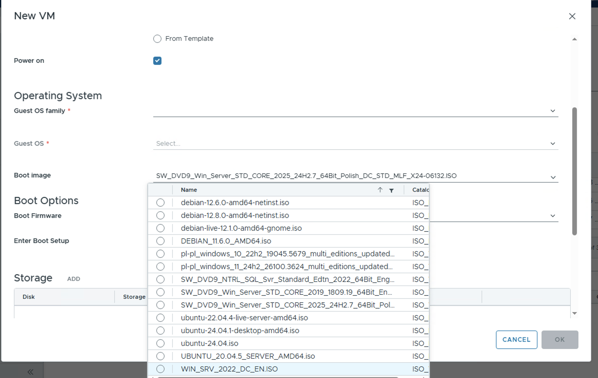 W nowym oknie wypełniamy pola dotyczące nazwy maszyny wirtualnej, w polu Type wybieramy New, a następnie wypełniamy sekcję Operating System o wybór: Guest OS family: Microsoft Windows, Guest OS: Microsoft Windows Server 2022 (64-bit) oraz wybieramy Boot image w tym przypadku będzie to obraz .iso z systemem Windows Server