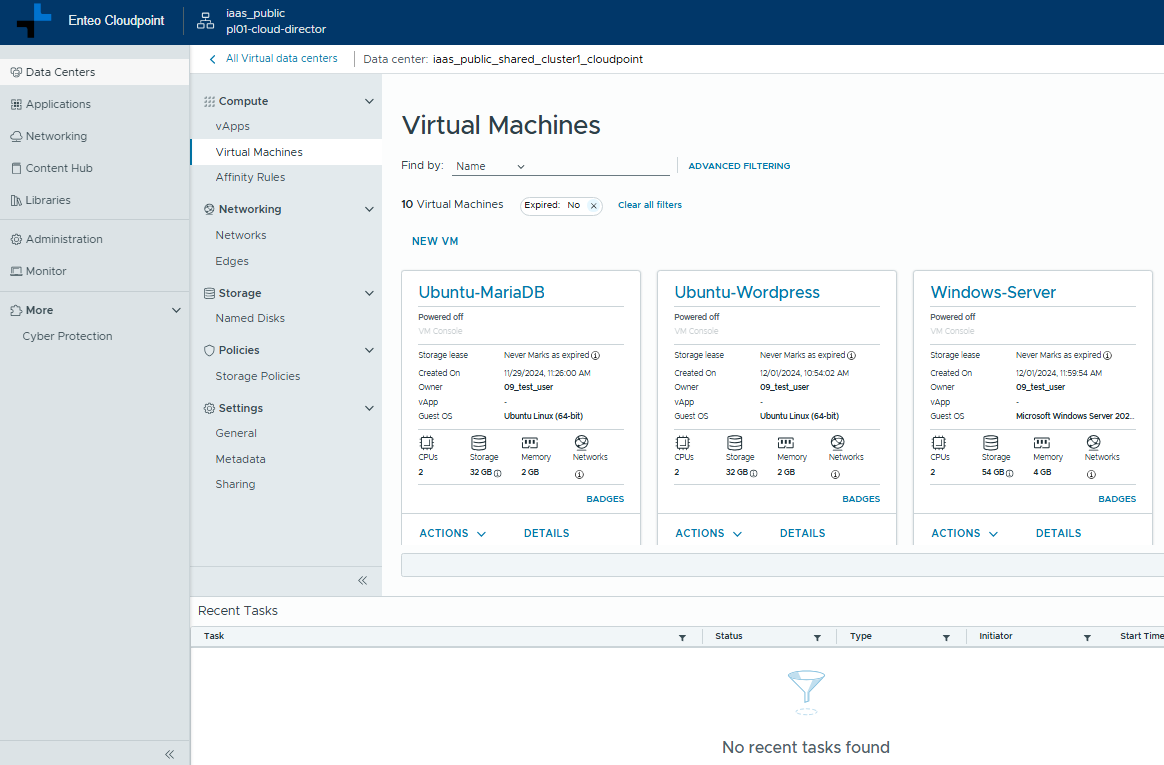 Logujemy się do Portalu Zarządzania Usługami IaaS i przechodzimy do VDC w ramach którego ma zostać przeprowadzona konfiguracja. Przechodzimy do sekcji Virtual Machines i klikamy new VM