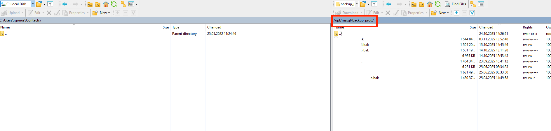 Po poprawnym połączeniu w prawej części ekranu wyświetlona zostanie lista plików na serwerze backupowym, a w lewej części drzewo plików na komputerze lokalnym. W prawej cześci należy przejść do ścieżki przesłanej w mailu z informacjami o sposobie logowania. Prawie zawsze będzie to jedna z poniższych ścieżek, w zależności czy operacja będzie dotyczyła środowiska produkcyjnego czy testowego:
