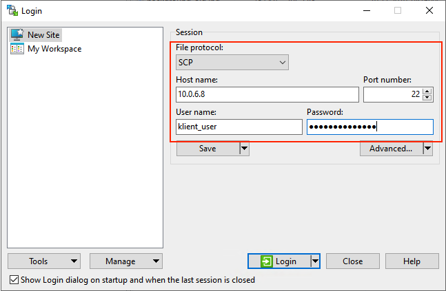 Podłączenie do serwera z bazami danych należy nawiązać za pomocą klienta FTP/SCP zainstalowanego na terminalu z wykorzystaniem danych przesłanych zgodnie z 2. punktem instrukcji. Poniżej przykład konfiguracji dla klienta WinSCP: